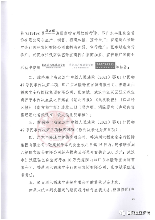 该二审民事判决中,被告广东丰隆珠宝首饰有限公司、香港周六福珠宝金行国际集团有限公司、武汉市江汉区弘艺珠宝商行和张建斌承担的责任如下:一、停止在生产、销售、招商加盟宣传推广中使用“香港周六福珠宝金行”等标识;二、要求其在判决生效之日起在《湖北日报》 《武汉晚报》 《深圳特区报》 《南方都市报》连续三日刊登声明、消除影响;三、连带赔偿周六福珠宝股份有限公司经济损失及合理开支共计500万元。