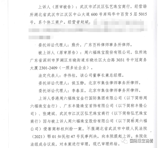 周六福珠宝股份有限公司获得商标维权案件胜诉,成功维护了自己的商标权益。