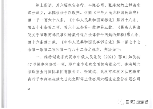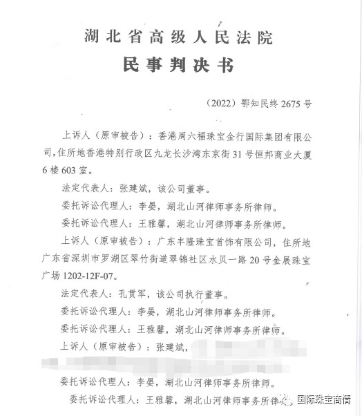 香港周六福珠宝金行国际集团有限公司等涉嫌侵犯周六福珠宝股份有限公司在先权利,以不正当行为谋取非法利益的行为终被判侵权。